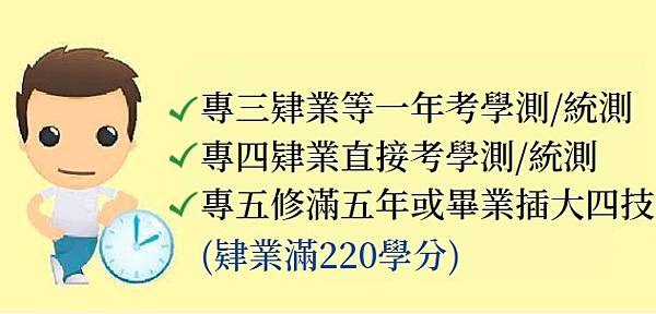 專三休學的部分,五專生在專三下學期讀完的時候,可以選擇休學一年考學測或統測,或者是專四讀完直接考學測或統測,亦可專五讀完插大四技或直接升學二技(只要修滿五年專科學歷就能考大學轉學考!)